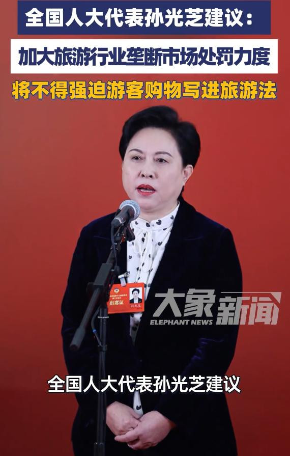 宇宙东谈主大代表孙光芝于两会期间建言,要将“不得强制购物”更为明确地载入《旅游法》。