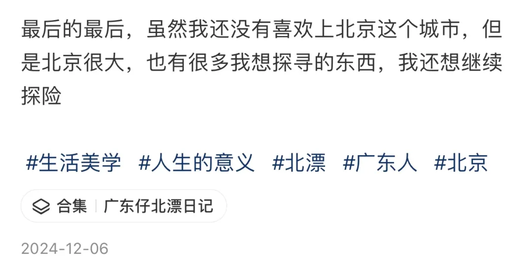 她吐槽过北京的烧腊饭里,确切被放了酸辣味的泡菜,险些是倒反天罡;也爱慕过“北京下雪的夜晚,让东谈主欢跃一直留在这里”。平均每两个月,她就会在“脱北”与“爱北”之间反复横跳一次。
