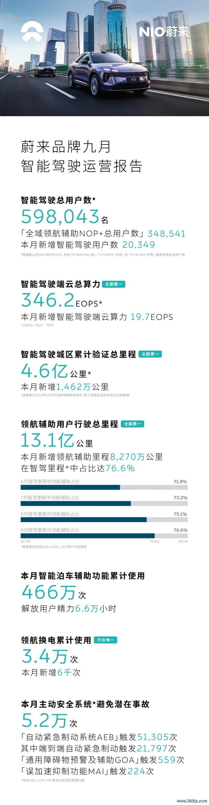 易车讯 日前,蔚来官方发布九月智能驾驶运营叙述。2024年9月新增智能驾驶用户20,349名,全域领航接济 NOP+用户数达348,541名,总用户数达598,043名。智能驾驶端云算力新增19.7EOPS,总算力达346.2EOPS。