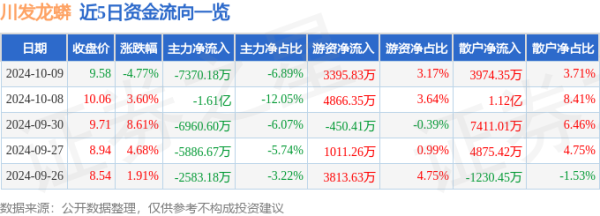 本站音信,规章2024年10月9日收盘,川发龙蟒(002312)报收于9.58元开云体育,下落4.77%,换手率6.18%,成交量108.44万手,成交额10.7亿元。