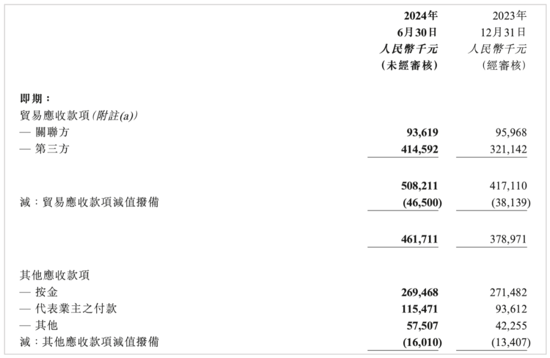 值得一提的事,限制2024年6月30日,德信做事的贸易应收款约为4.62亿元。其中,自关联方的部分为9361.9万元,较年头减少234.9万元;来自第三方的部分为4.15亿元,较年头增多约9400万元。