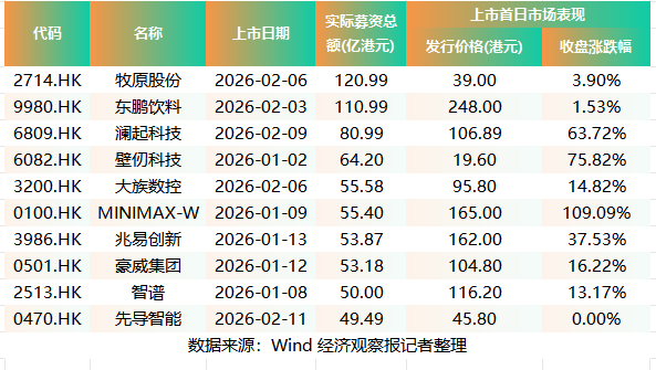 从募资额角度看,第一季度港股前五大 IPO诀别为牧原股份(02714.HK)、东鹏饮料(09980.HK)、澜起科技(06809.HK)、壁仞科技(06082.HK)、巨室数控(03200.HK),诀别募资约120.99亿港元、110.99亿港元、80.99亿港元、64.20亿港元、55.58亿港元。2025年第一季度,港股IPO募资额“第一股”是蜜雪集团(02097.HK),其骨子募资总额为39.72亿港元。